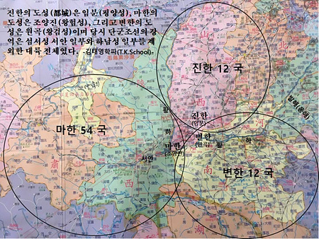 Áø¼ö°¡ ÁöÀº <»ï±¹Áö>¿¡ ¡°ÇÑ(ùÛ)[¹éÁ¦]Àº ´ë¹æ(ÓáÛ°)ÀÇ ³²ÂÊ¿¡ ÀÖ°í ¡¦ÇÑ¿¡´Â ¼¼ Á¾·ù°¡ ÀÖÀ¸¸ç Çϳª´Â ¸¶ÇÑ(Ø©ùÛ), µÑ°´Â ÁøÇÑ(òãùÛ), ¼Â°´Â º¯ÇÑ(ܧùÛ)Àε¥ ÁøÇÑÀº ¿¾ Áø±¹(òãÏÐ: ´Ü±ºÁ¶¼±)ÀÌ´Ù. ¸¶ÇÑÀº [»ïÇÑ Áß¿¡¼] ¼ÂÊ¿¡ À§Ä¡ÇÏ¿´´Ù.¡±¶ó°í ±â¼úÇϰí ÀÖ´Ù.