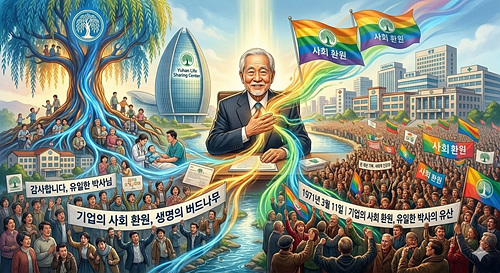 "±â¾÷¿¡¼ ¾òÀº ÀÌÀÍÀº ±× ±â¾÷À» Ű¿öÁØ »çȸ¿¡ ȯ¿øÇØ¾ß ÇÑ´Ù"´Â ½Å³äÀ» ¸ö¼Ò ½ÇõÇÑ À¯ÀÏÇÑ ¹Ú»ç°¡ ¼¼»óÀ» ¶°³µ½À´Ï´Ù. Àü Àç»êÀ» »çȸ¿¡ ±âºÎÇϸç Çѱ¹ ±â¾÷°¡ Á¤½ÅÀÇ °¡Àå ³ôÀº °÷¿¡ À̸§À» ¿Ã¸° ±×ÀÇ »îÀº ¿À´Ã³¯¿¡µµ Å« ¿ï¸²À» ÁÝ´Ï´Ù.