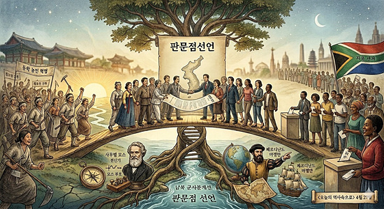 ³²ºÏ Á¤»óÀÌ ÆÇ¹®Á¡ ±º»çºÐ°è¼±À» ³ª¶õÈ÷ ³Ñ³ªµé¸ç ÇѹݵµÀÇ ÆòÈ­¿Í ¹ø¿µ, ÅëÀÏÀ» À§ÇÑ ¿ª»çÀûÀÎ 'ÆÇ¹®Á¡ ¼±¾ð'À» ¹ßÇ¥ÇÑ ³¯ÀÔ´Ï´Ù. "Çѹݵµ¿¡ ´õ ÀÌ»ó ÀüÀïÀº ¾ø´Ù"´Â ¼±Æ÷´Â Àü ¼¼°è¿¡ ±íÀº ¿ï¸²À» ÁÖ¾ú½À´Ï´Ù. ÀÌ´Â ´Ü¼øÈ÷ Á¤Ä¡Àû ÇÕÀǸ¦ ³Ñ¾î, ¿À·§µ¿¾È ²÷°ÜÀÖ´ø ¹ÎÁ·ÀÇ Ç÷¸Æ(úìØæ)À» ÀÕ°í »õ·Î¿î °øÁ¸ÀÇ ½Ã´ë¸¦ ¿­°íÀÚ Çß´ø ¶ß°Å¿î ¿­¸ÁÀÇ ±â·ÏÀÔ´Ï´Ù.